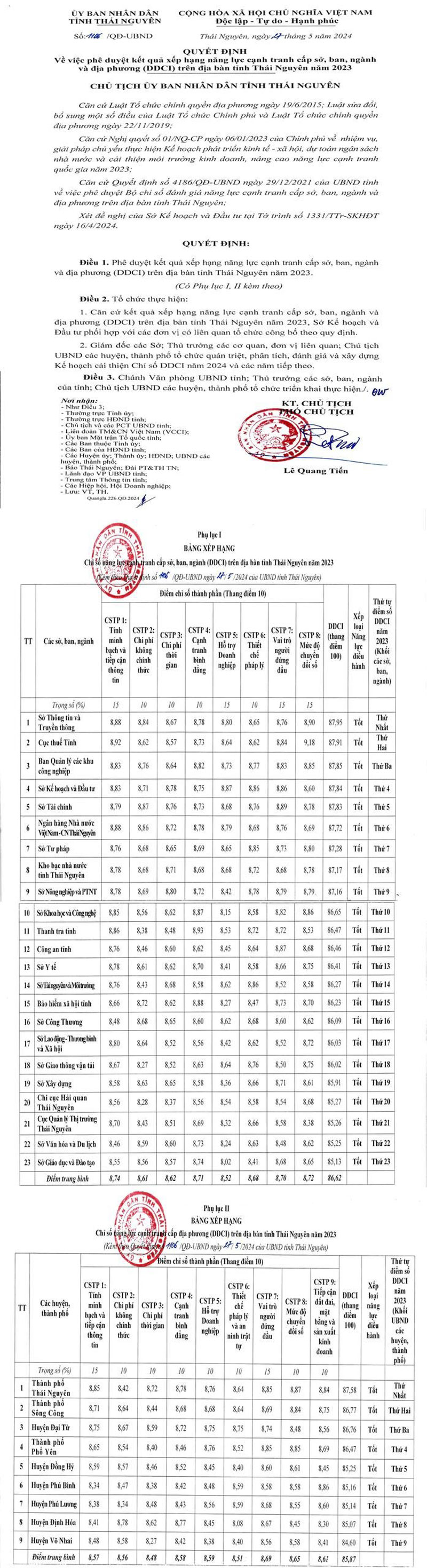 Ngày 27-5, UBND tỉnh Thái Nguyên ban hành Quyết định về việc phê duyệt kết quả xếp hạng năng lực cạnh tranh cấp sở, ban, ngành và địa phương (DDCI) trên địa bàn tỉnh Thái Nguyên năm 2023. Báo Thái Nguyên đăng tải toàn văn Quyết định và kết quả chi tiết.